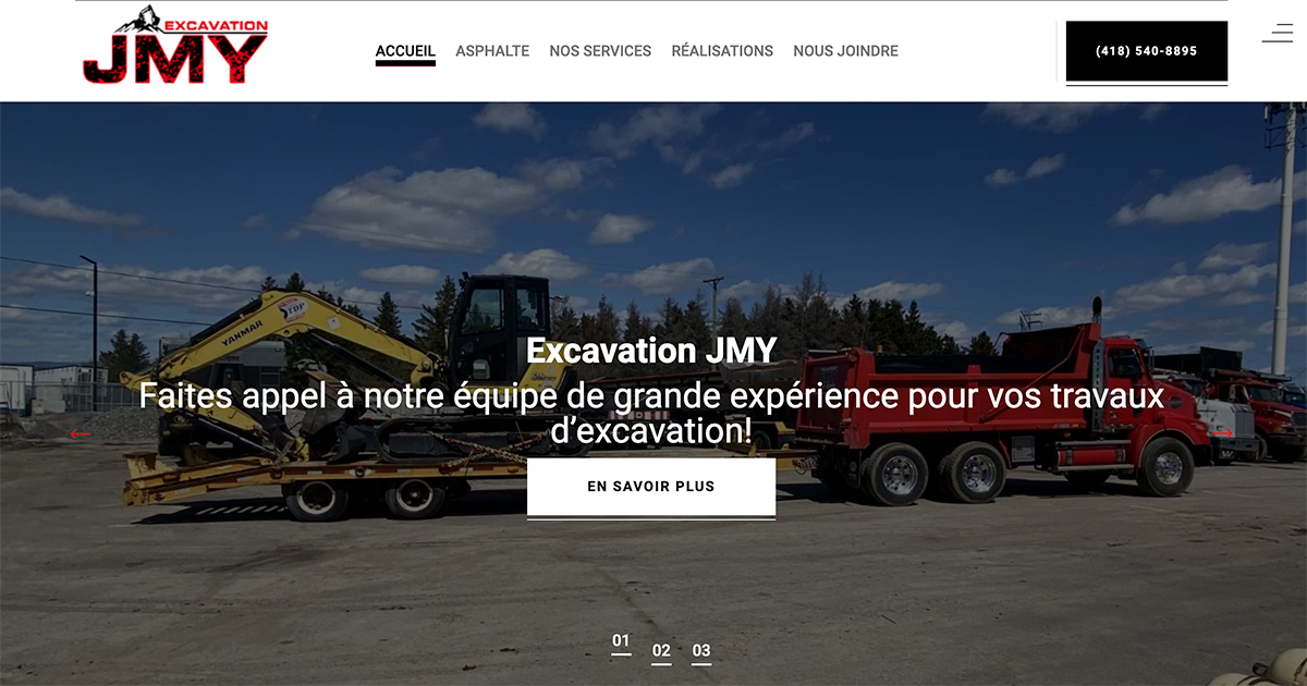 Excavation JMY is an experienced excavation company serving Jonquière, Chicoutimi, and surrounding areas. They offer a wide range of services including excavation, landscaping, paving, French drains, septic systems, and water main installation.